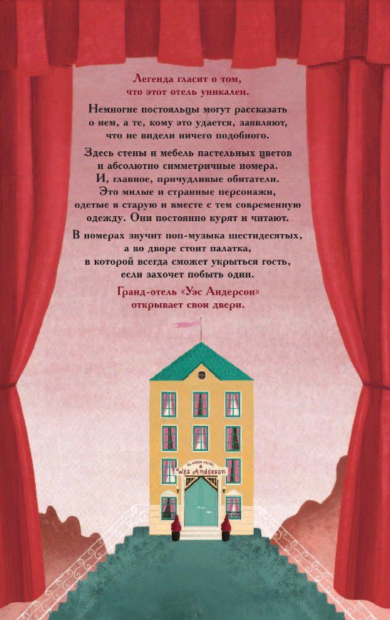 Добро пожаловать в гранд-отель Будапешт! Яркие рисунки Нурии Диас расскажут вам все о талантливом кинорежиссере Уэсе Андерсоне и его главном детище. Вы сможете пройти вместе с Уэсом его путь к славе, узнать больше о его творчестве и прогуляться по коридорам одного из самых знаменитых отелей.