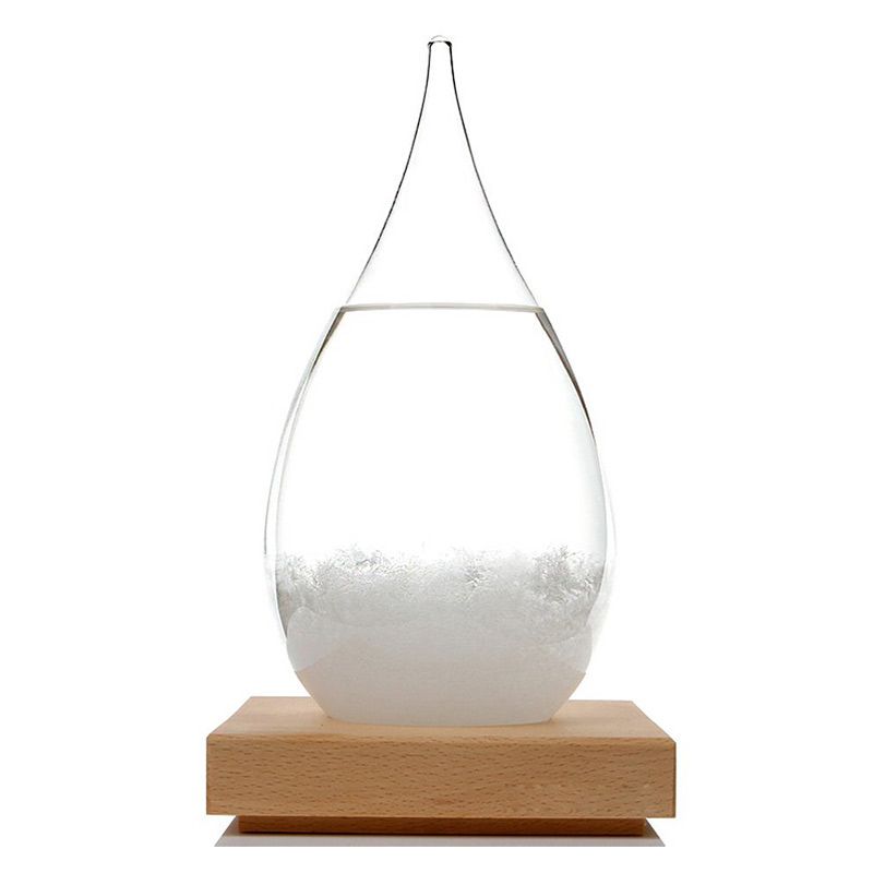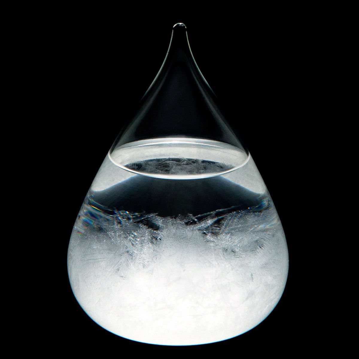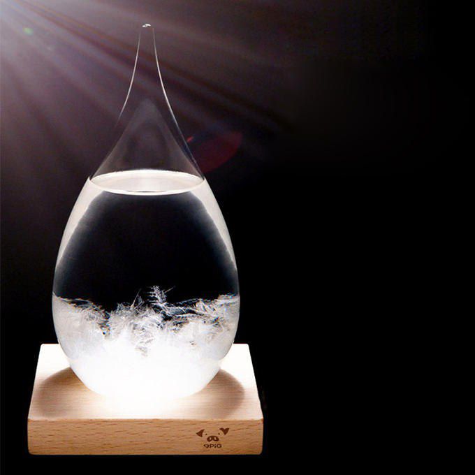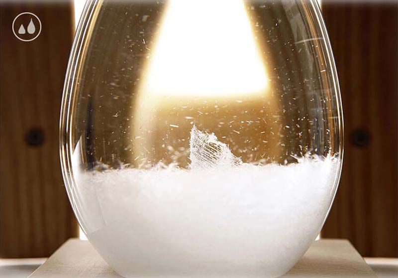 Штормгласс - красивая колба с раствором камфоры умеет предсказывать погоду. Например при потеплении колба будет становится прозрачной, а при похолодании - выпадет большой осадок хлопьев камфоры.